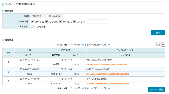 ファイルリンクのダウンロードログ一覧が表示されます。